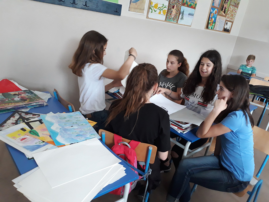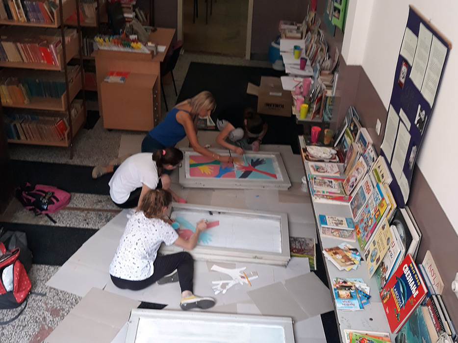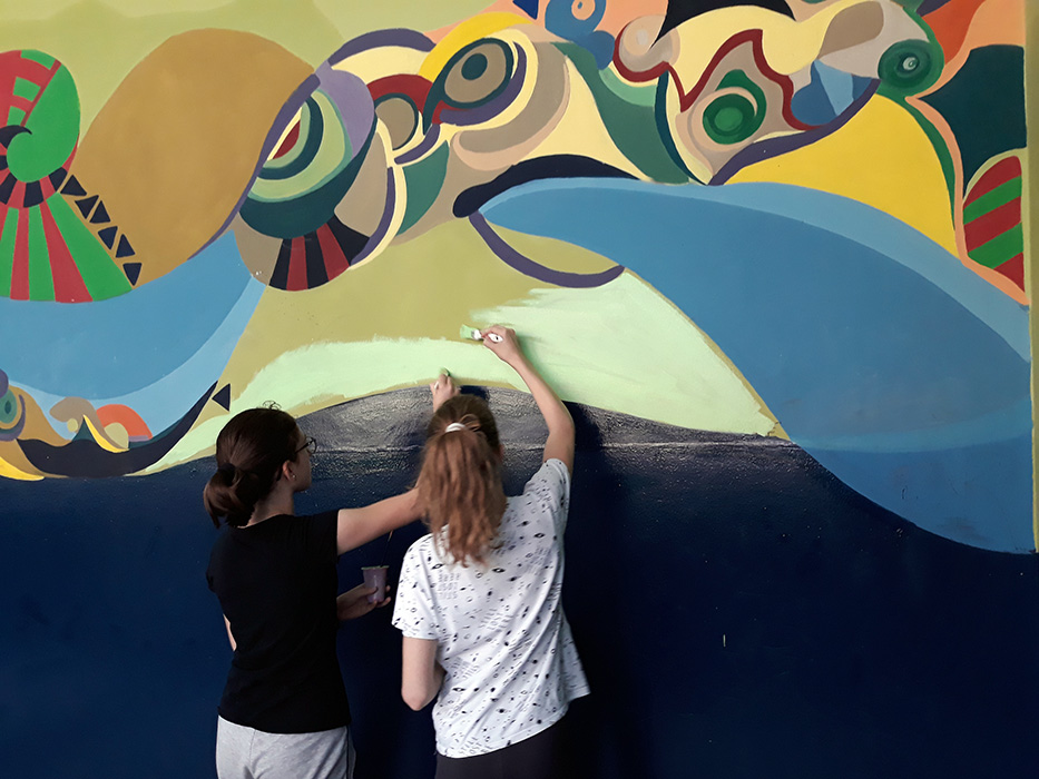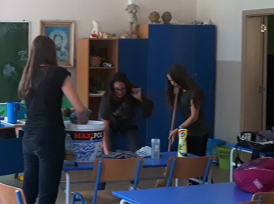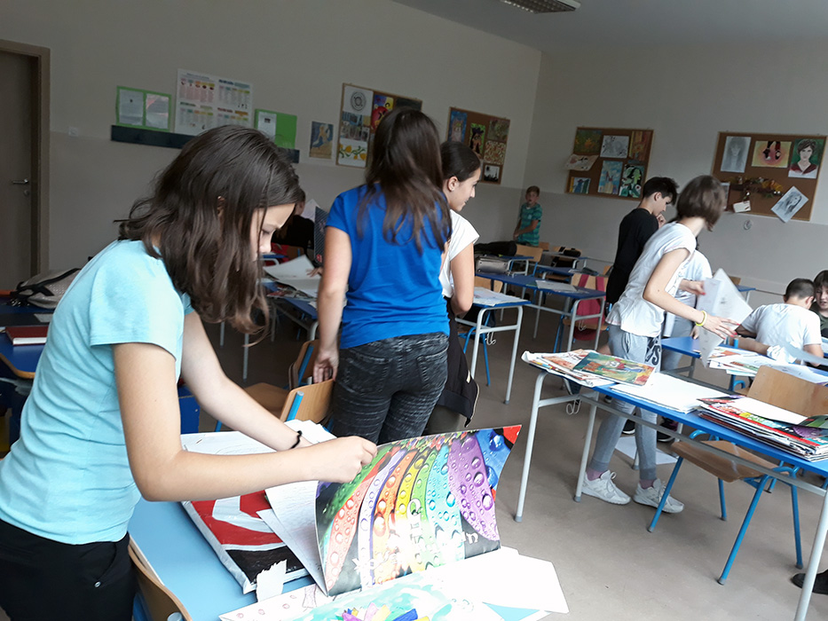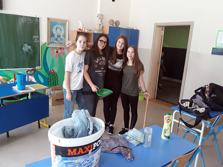 | Последње часове наставе ликовне културе ученици су провели у естетском уређењу школе и сређивању кабинета за ликовну културу. Насликан је један мурал, осликани су прозори у школској библиотеци, освежени су стари мурали, офарбани радијатори и очишћен је кабинет за ликовну културу. |