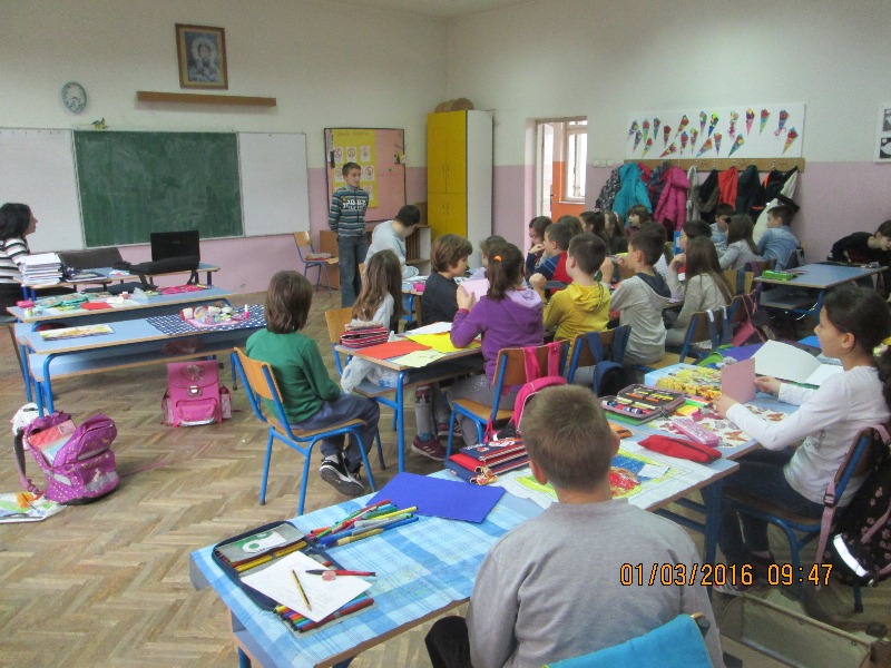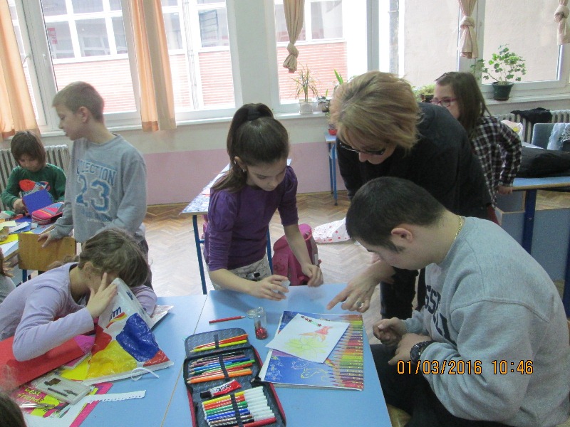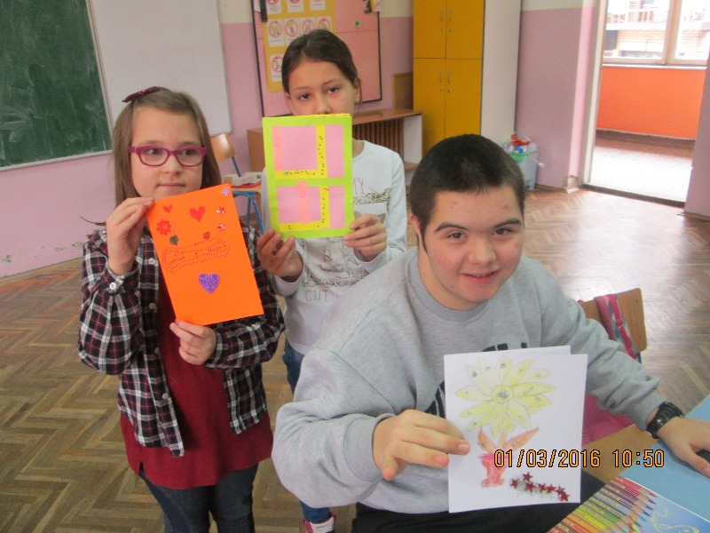 Инклузивни час ликовне културе ученика II 1 и ученика са сметњама у развоју одржан је 1.3.2016.год. Циљ часа био је да се кроз дружење, кооперативан рад ученици упознају, уче да слушају једни друге и поштују правила рада. Низале су се песме о мами, баки, поруке и жеље упућене њима. Групе су, приликом израде честитки, користиле различите материјале и технике рада (цртање, отискивање, изрезивање, склапање ). Чули су се савети како најбоље изрезати облик, како залепити делове, похвале упућене једни другима, занимљива питања и још духовитији одговори. Задовољство ученика, мноштво занимљивих радова разлог су да оваквих часова буде више.