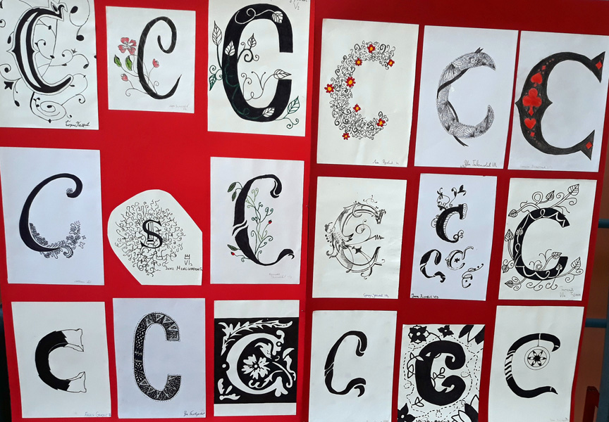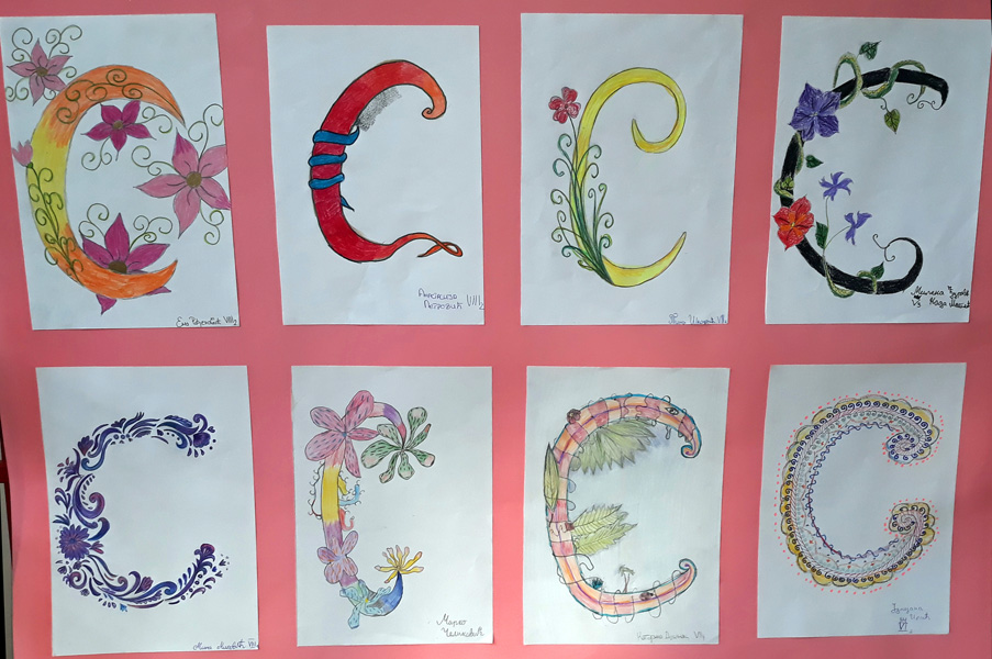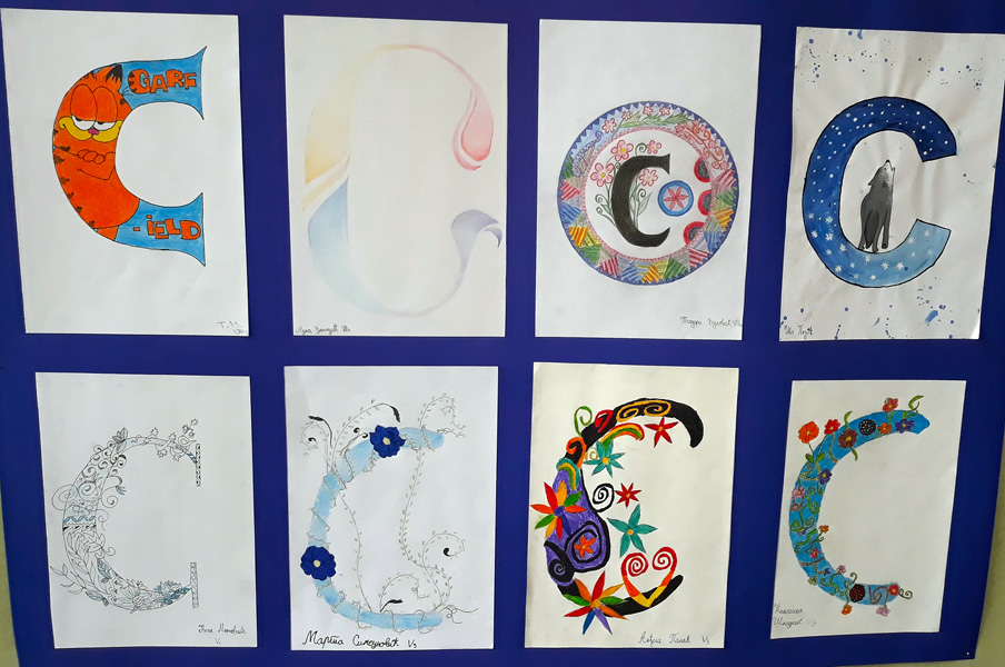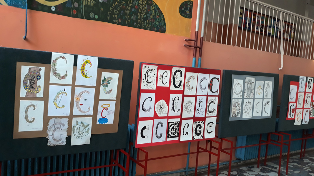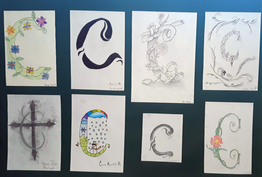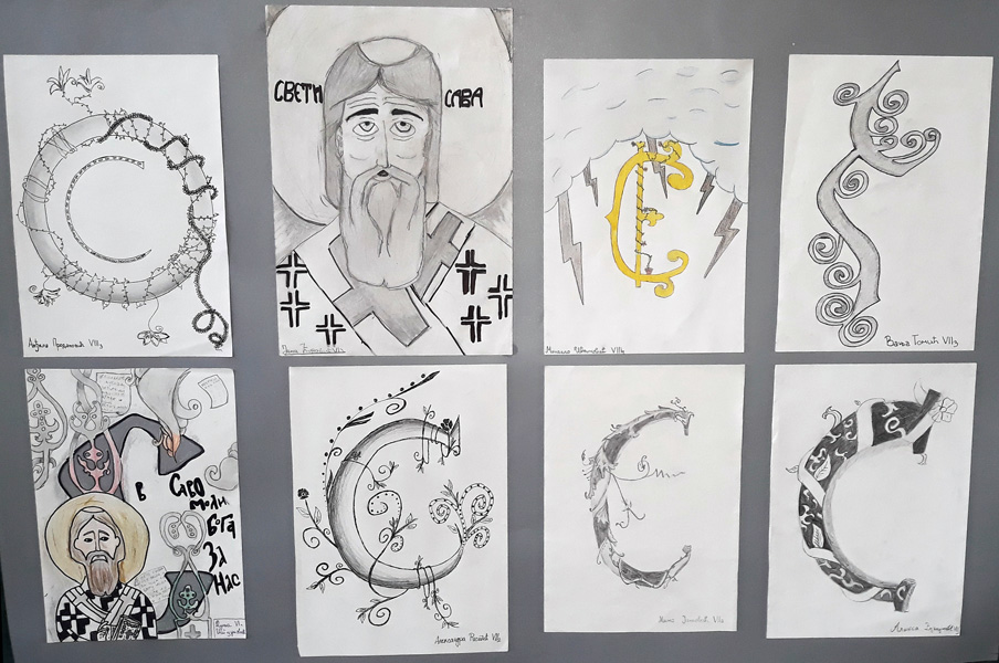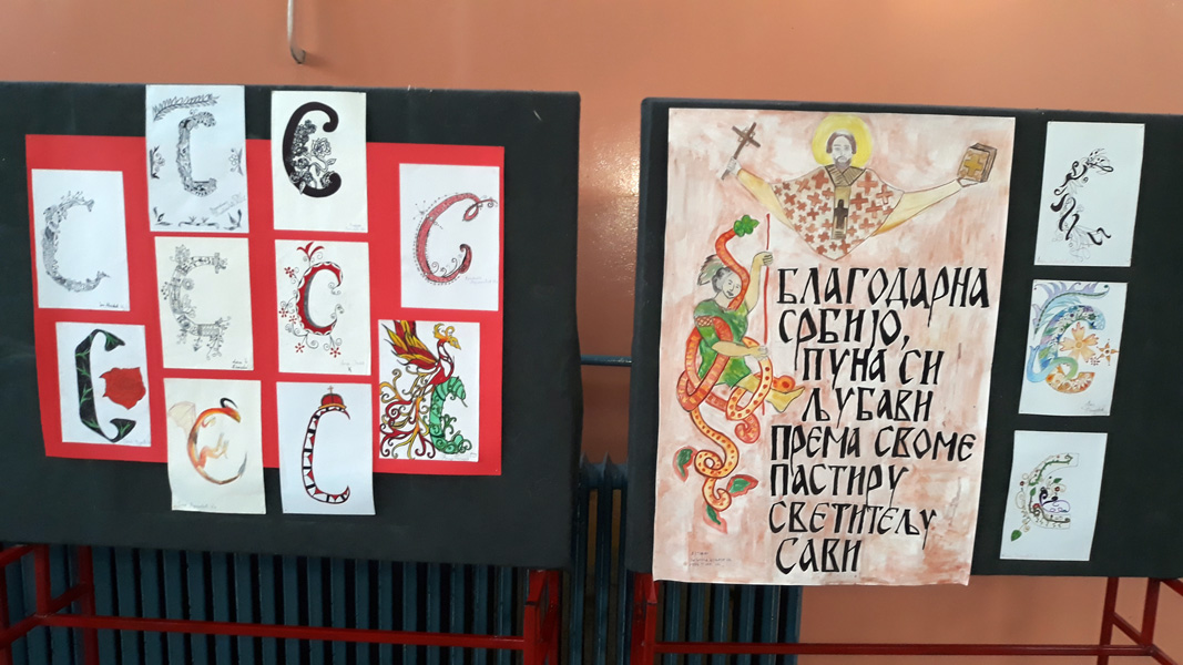 Поводом Савиндана у холу школе постављена је изложба ликовних радова на тему “Иницијал”. Инспирисани средњовековним уметничким наслеђем, као и рукописном баштином , ученици су на занимљив и креативан начин представили слово “С”. Раскошну орнаменталну форму иницијала чинили су геометријски мотиви као и стилизовани прикази биљака, животиња и људи. Избор технике је био слободан. |