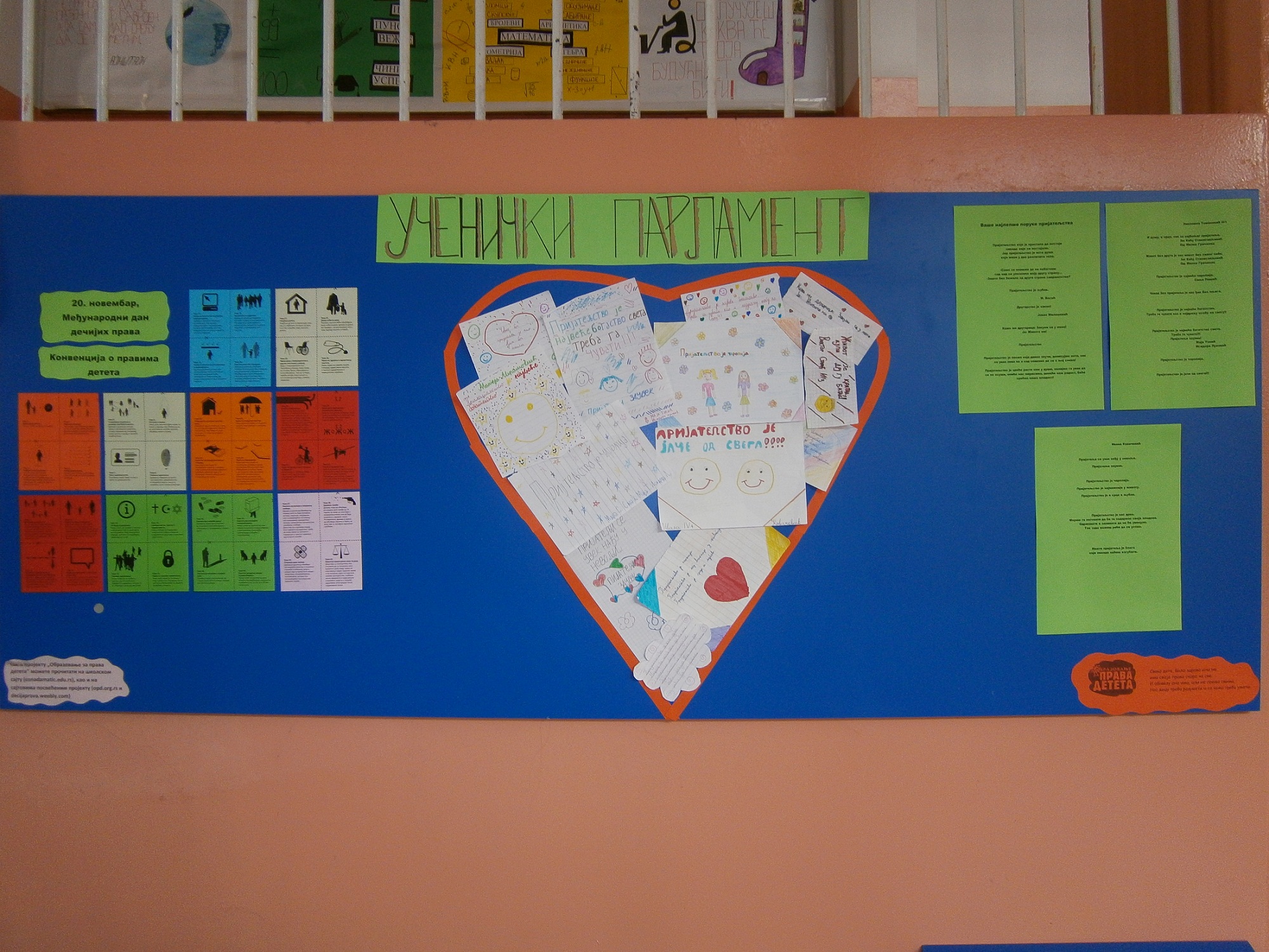 Током октобра, на позив чланова Ученичког парламента, ученици наше школе убацивали су у Кутију предлога своја  размишљања о пријатељству. Поводом Међународног дана детета, 20. новембра, Ученички парламент, заједно са наставницом италијанског језика Милицом Мариновић, одабрао је најлепше дечије мисли о пријатељству које,  у једном великом срцу,  красе таблу Парламента у холу школе. Поред мисли о пријатељству, ту је и Конвенција о правима детета…