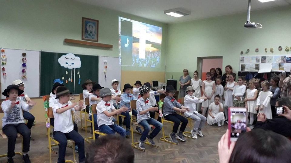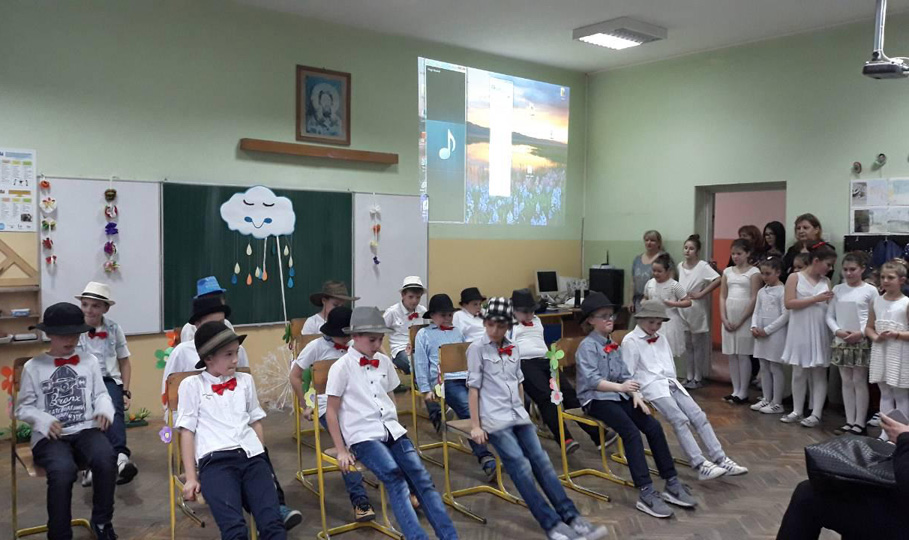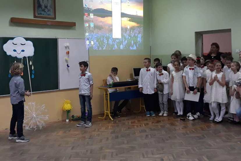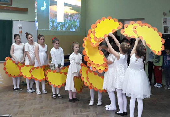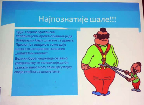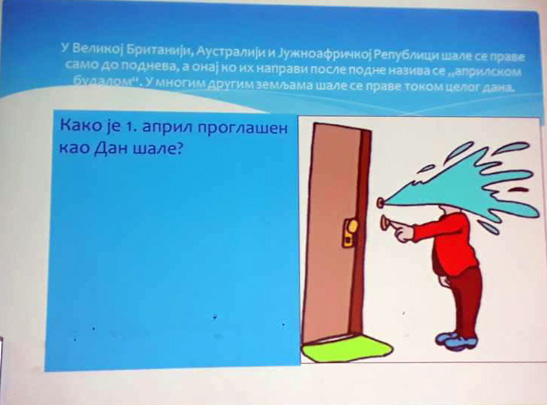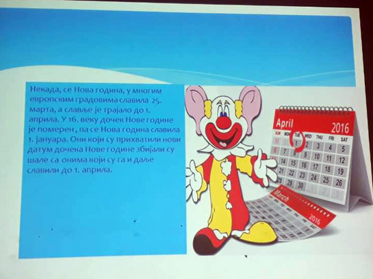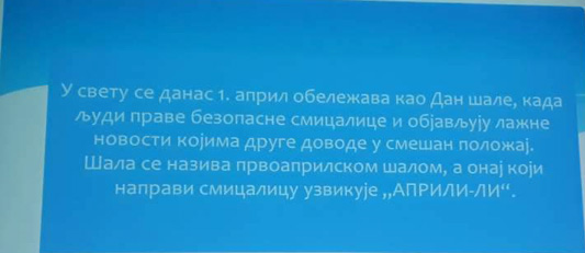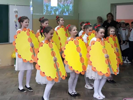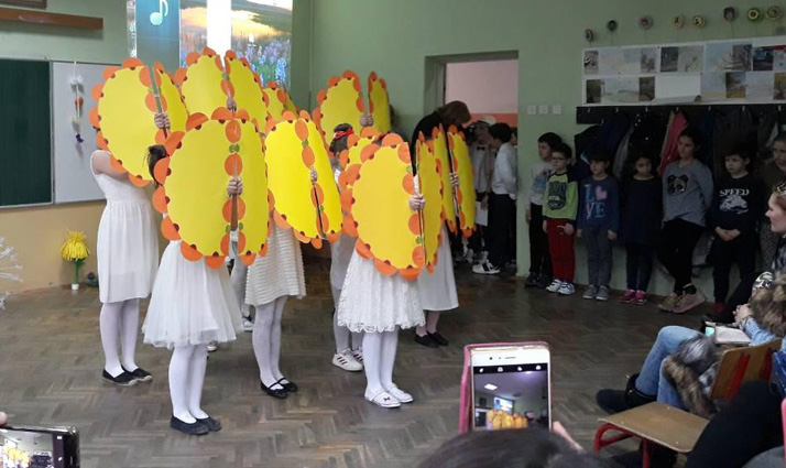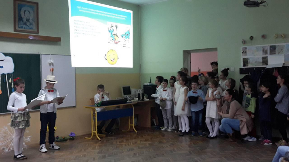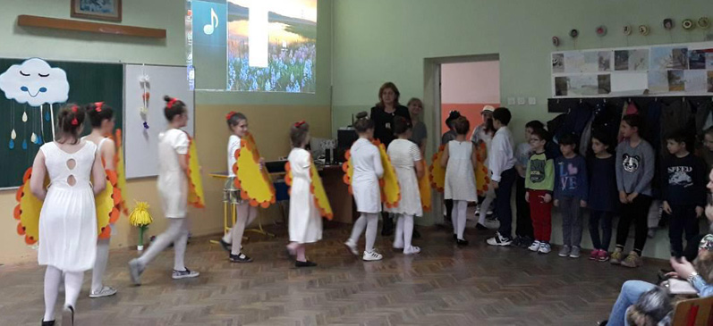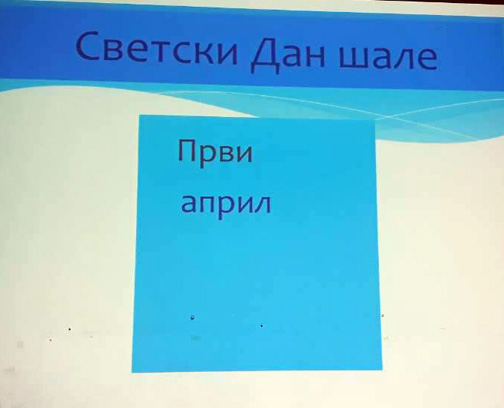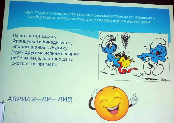 Ученици III3 и III4 потрудили су се да својим родитељима и наставницима школе, 28.марта 2018. године, приреде лепо пролећно вече. После поздрава, ученици су песмом и плесом поздравили долазак пролећа. Након тога је уследила презентација на тему Међународни дан шале. Присутни су се слатко смејали изведеним дечијим шалама. На крају су дечаци извели свој плес. |