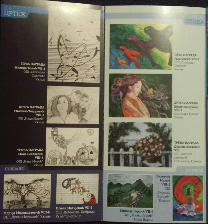 На ликовном конкурсу ,,Мој свет“ који је расписала Уметничка школа из Ужицa, уз подршку Школске управе, ученици наше школе постигли су запажен успех. На конкурсу је учествовало седамнаест школа са ширег подручја Златиборског округа, са више од стотину радова. У категорији најбољег цртежа, ученик Михаило Тодоровић VIII1 освојио је другу, а ученица Мина Селаковић VIII1 трећу награду. Ученица Кристина Буквић VIII1 освојила је другу награду у категорији најбоље слике. Награђени ученици, у пратњи наставнице ликовне културе Оливере Шуљагић, присуствовали су свечаном отварању изложбе и додели награда у просторијама Уметничке школе, 21. маја 2016. године. Изложба је организована као један вид активности у оквиру највеће европске културне манифестације ,,Ноћ музеја“, чији је један од циљева едукација најмлађих, промовисање истинских вредности и лепоте уметничког стварања. Након доделе награда, ученици су учествовали у богатом програму Уметничке школе, у добро осмишљеним активностима и креативним радионицама, реализованим у врло пријатној, стваралачкој атмосфери.
