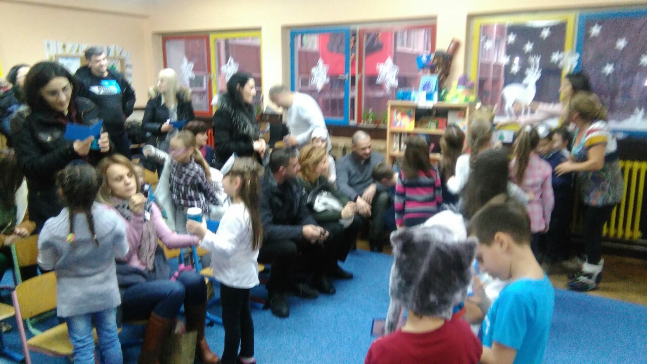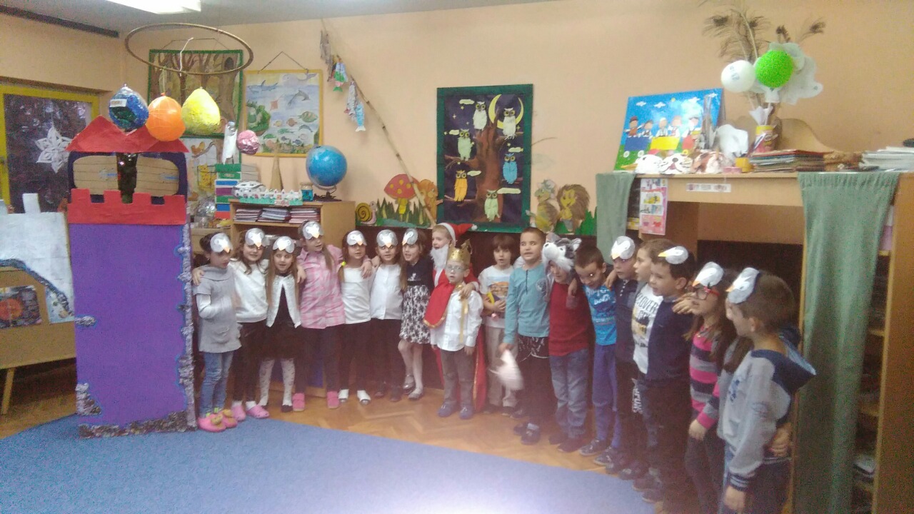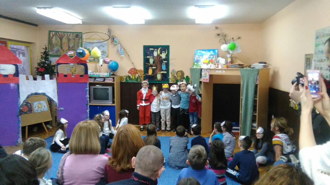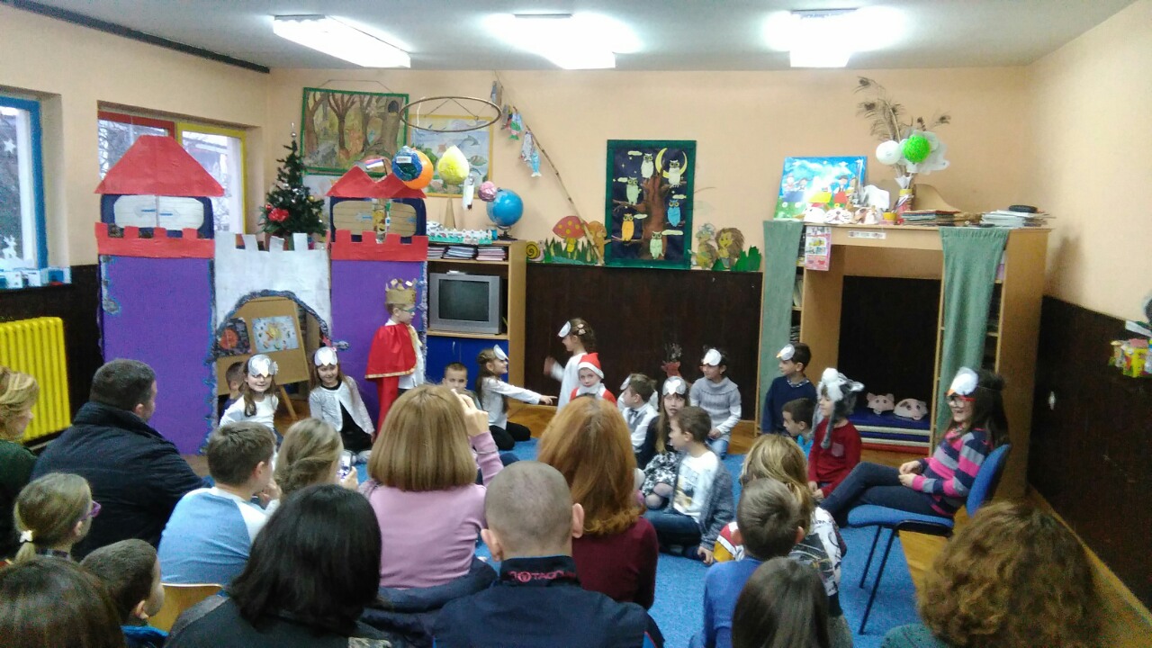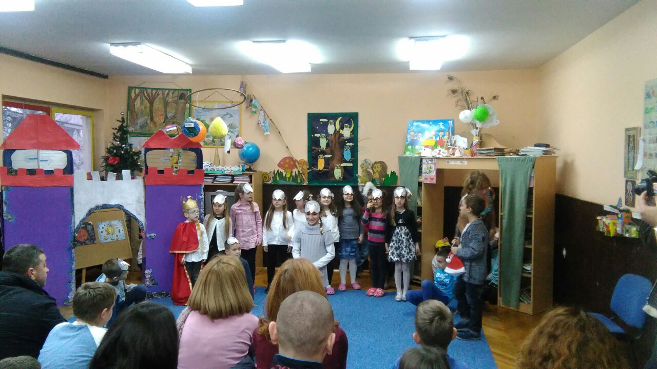 Предшколска група васпитачице Снежане Шаровић одржала је новогодишњу приредбу, у понедељак, 28. децембра 2015. године. У присуству великог броја родитеља и наставника школе, у веселој и разиграној атмосфери, предшколци су извели драмски текст „Краљ“, игру уз музику „Пут око света“, „Вртић пингвина“, причу у стиху, певали су песме „Дођи Деда Мразе“ и „Нађи дугу“ и извели драмски текст „Вук и три прасета“. Уз занимљиве маске, костиме и сценографију, веселу музику, разноврсне драмске методе и технике (наративна пантомима, замрзнуте слике, игра улога, замишљено путовање, вођена машта и групна драматизација) и различите облике рада са децом, остварени су сви планирани циљеви ове активности: учење програмског садржаја, подржавајући дечију природну потребу да се прерушавају, стављање детета у центар васпитно-образовне праксе, узбудљива, забавна и хумористичка нота дата кроз процес учења и развоја, као и стварање прилике да се родитељи упознају са радом групе. Овом угледном активношћу, на најлепши и најрадоснији начин, наши предшколци обележили су одлазак старе и долазак нове године.