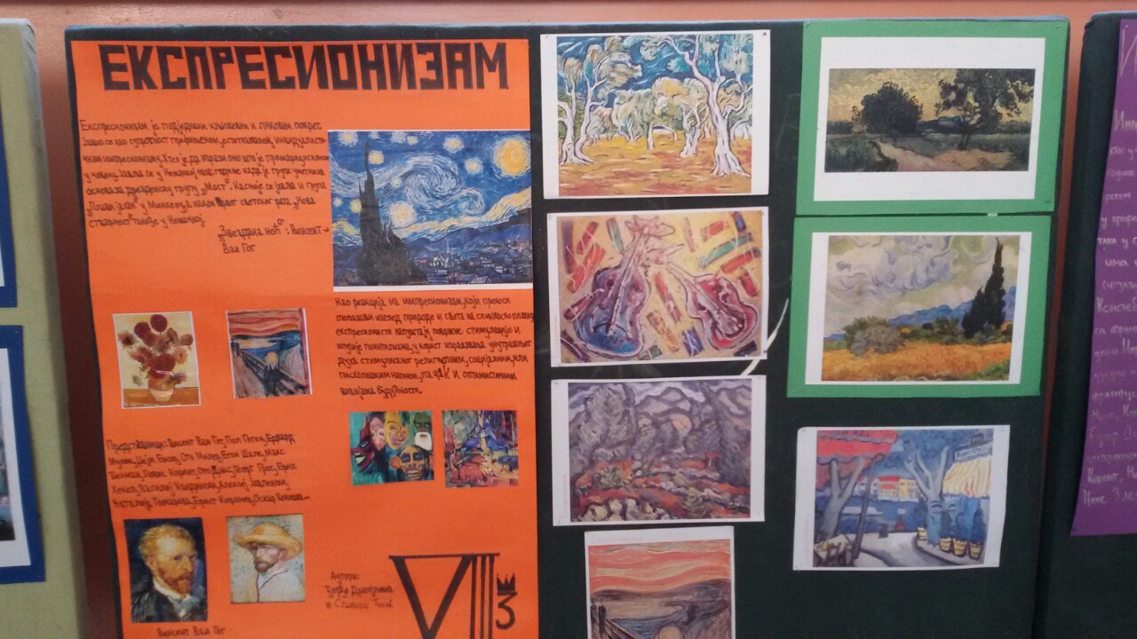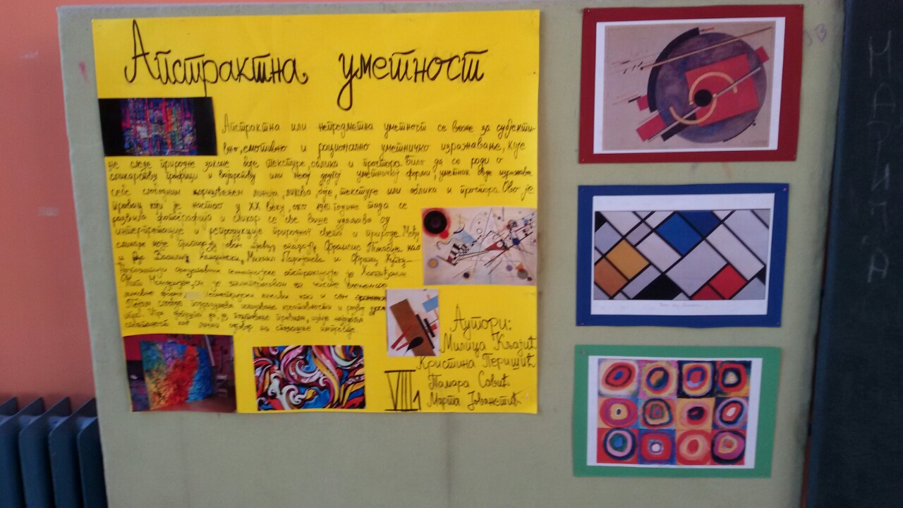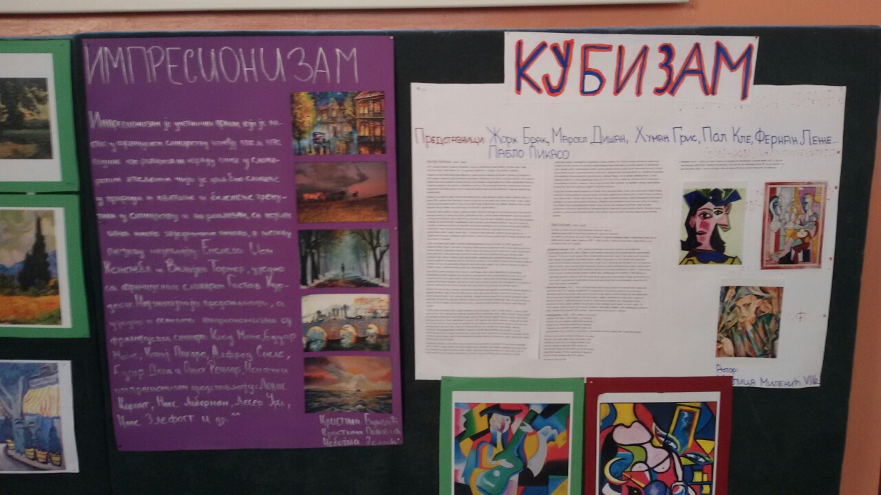 У холу школе је постављена постер презентација ученика осмог разреда из области историје ликовне уметности. Ученици су на основу истраживачког рада, користећи различите изворе информација, представили по један правац модерне уметности по сопственом избору. Радове су радили у групама од по 4 – 5 чланова.