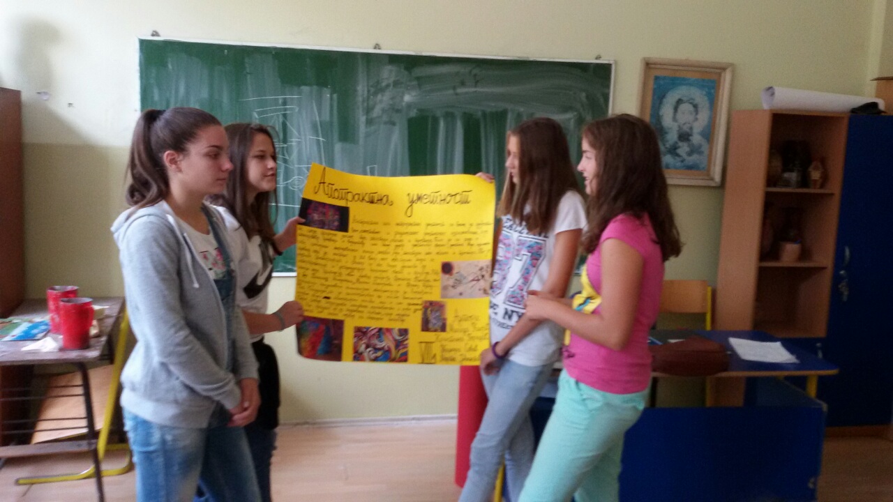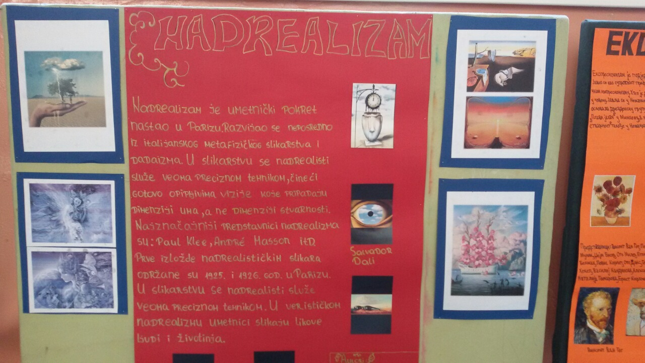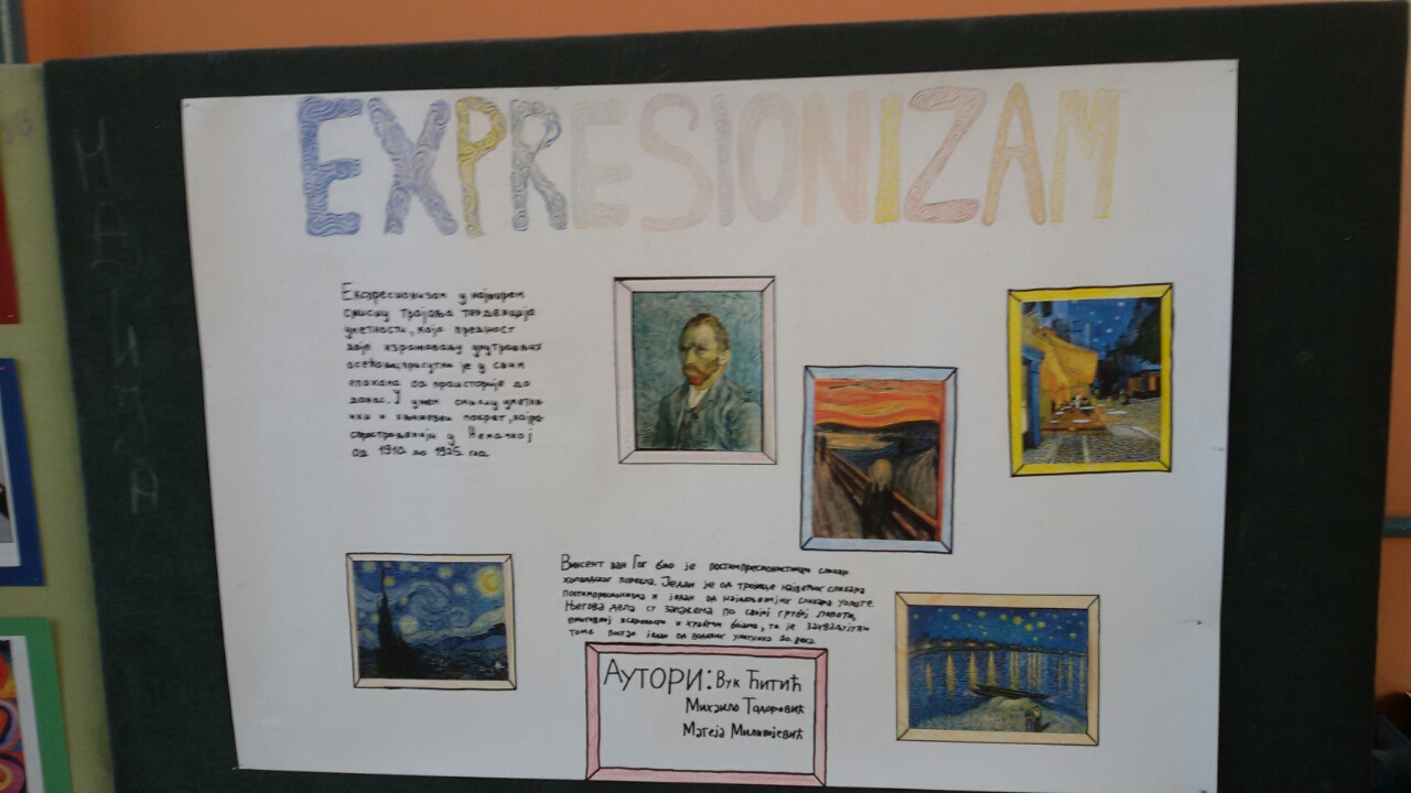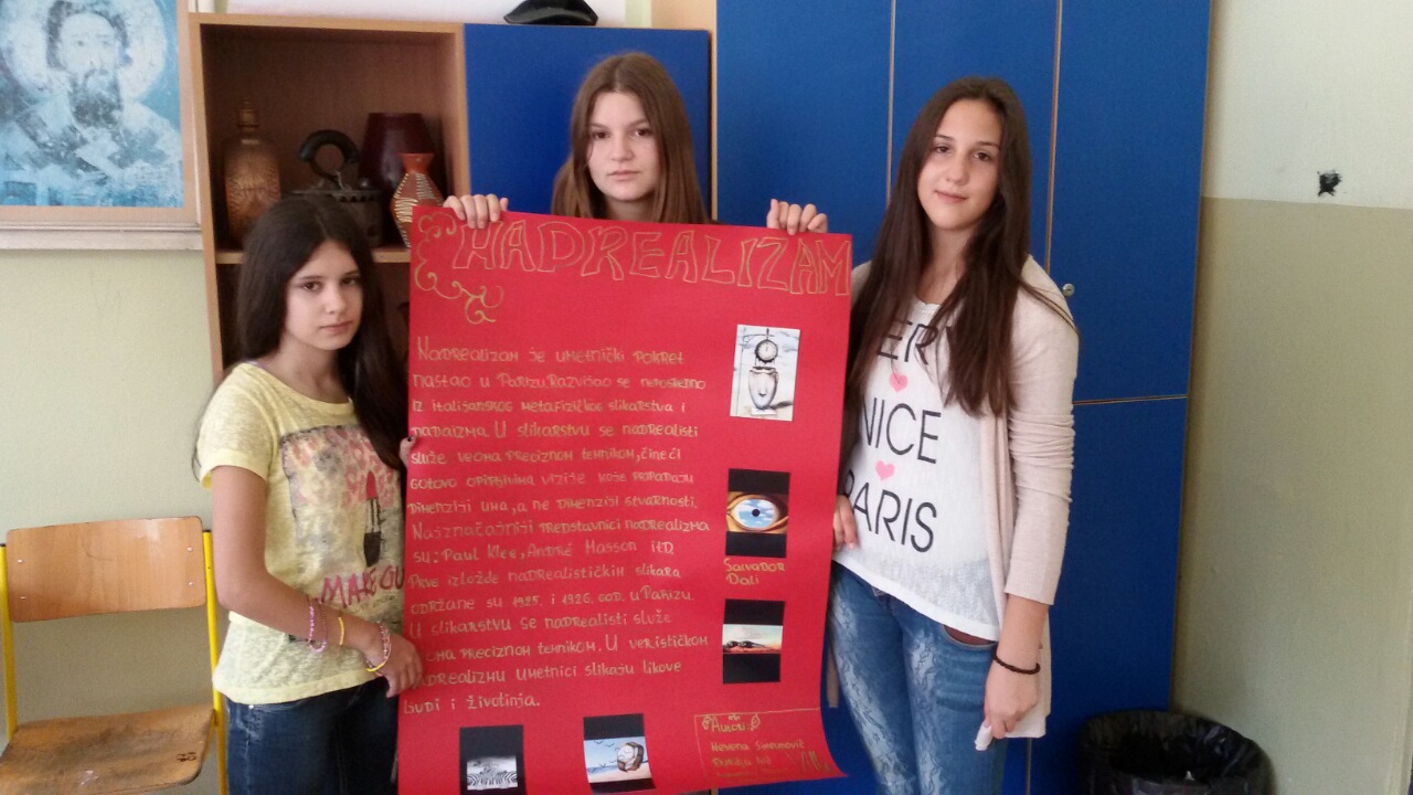 У холу школе је постављена постер презентација ученика осмог разреда из области историје ликовне уметности. Ученици су на основу истраживачког рада, користећи различите изворе информација, представили по један правац модерне уметности по сопственом избору. Радове су радили у групама од по 4 – 5 чланова.