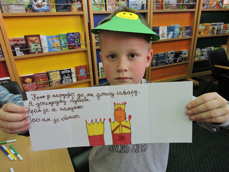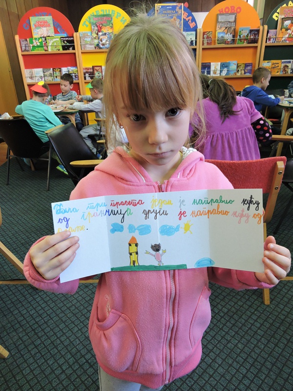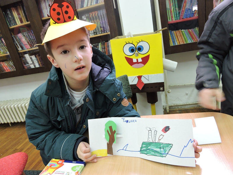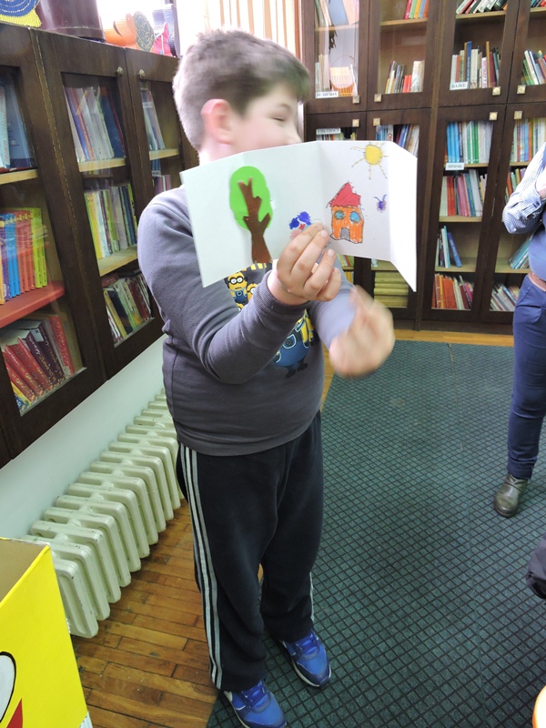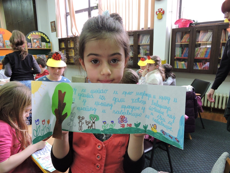Библиотекарка Ратка Митровић је на занимљив начин водила ученике кроз свет књига. Лагано им је откривала зашто књиге постоје и зашто их је добро читати. Занимљивим питањима их је подстицала да причају о слободи, игри, дружењу, одрастању,…Малени ђаци су је слушали веома пажљиво и са одушевљењем учествовали у разговору. А онда су сви постали мали ствараоци. Свој свет из маште претворили су у своју прву сликовницу.