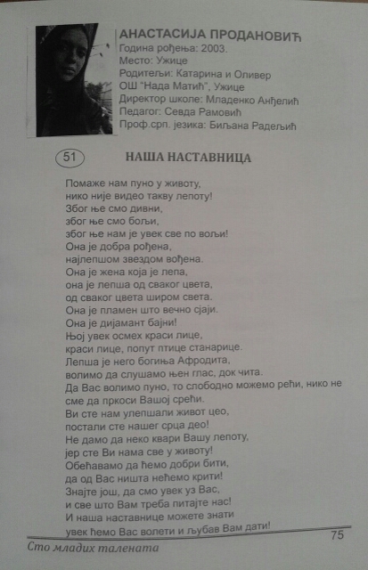 Песма „Наша наставница“ објављена је у зборнику поезије „Сто младих талената“ Златиборског округа 2016. године.