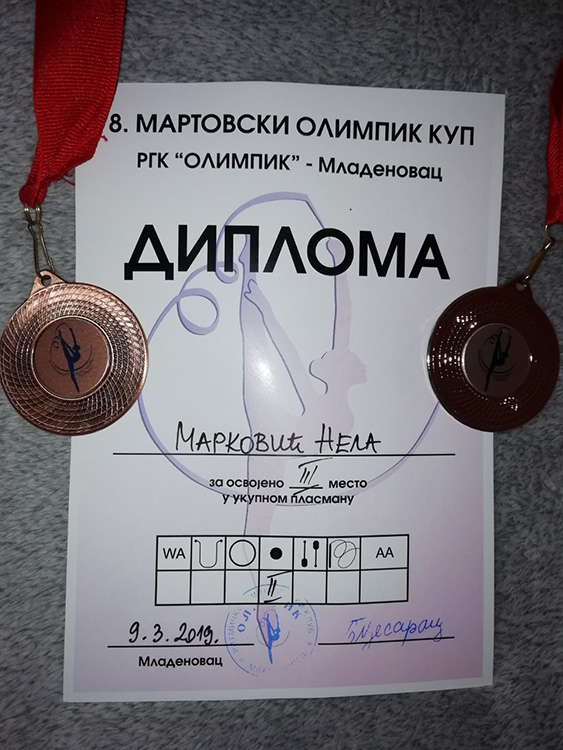 Нела Марковић, ученица VI1, oсвојила је треће место у укупном пласману на 8. Мартовском олимпик купу из ритмичке гимнастике у Младеновцу.