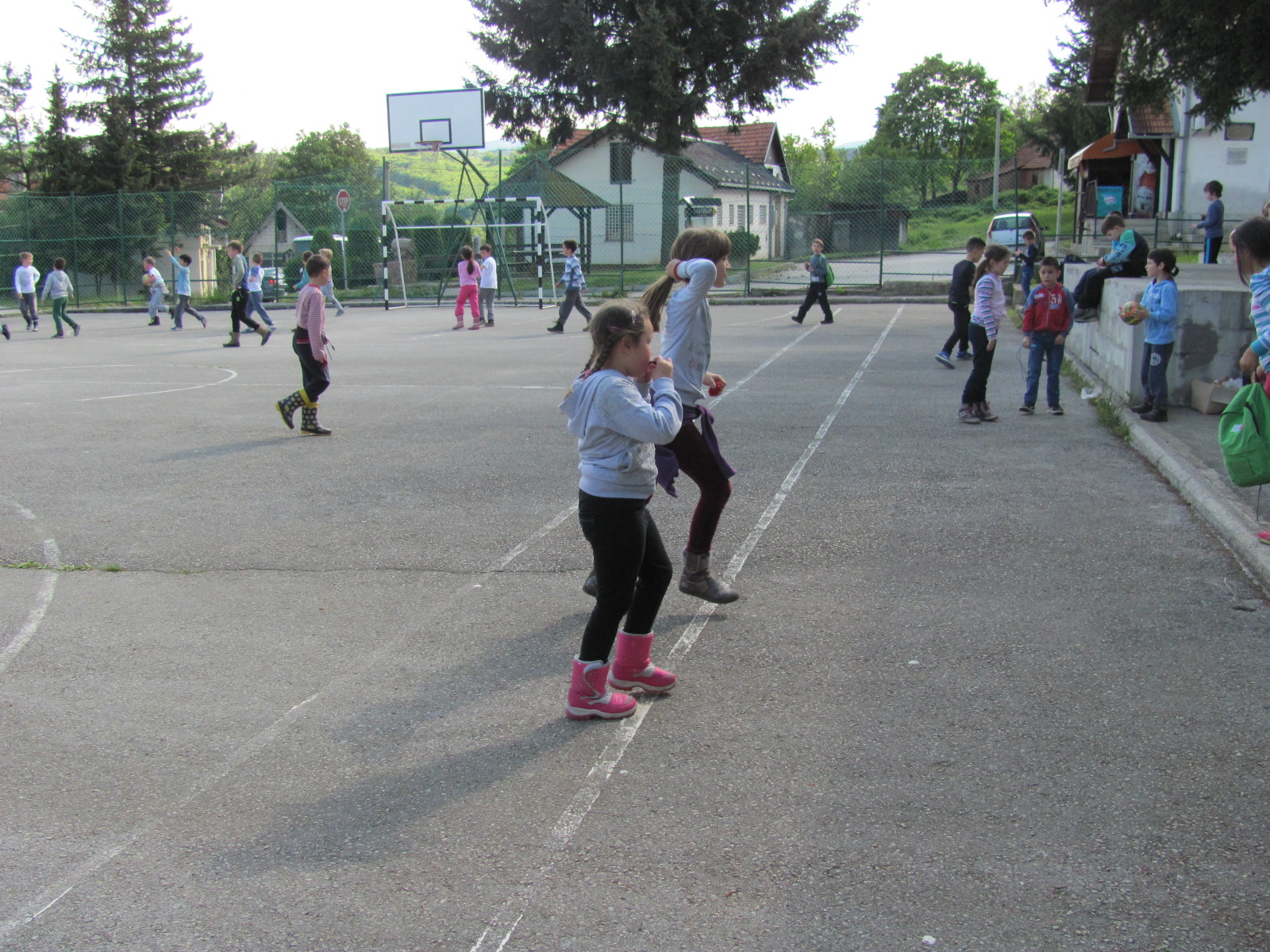 Враћамо се у сунчану и топлу реалност. На школском игралишту у Рожанству – предах за игру: кошарка, клацкалице, пољанче.