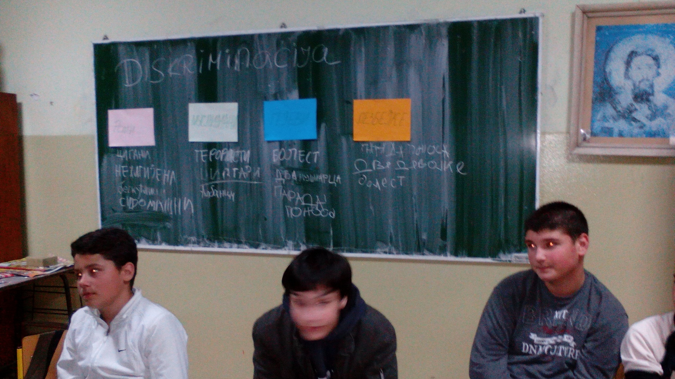 Едукација је започела „Игром упознавања“, а наставила се радионицом о дискриминацији. Циљ је био да ученици схвате да у нашем друштву постоје дискриминисане групе, да наведу предрасуде у вези са тим, да их разврстају на позитивне и негативне и уоче која су им права угрожена. Уследио је разговор о осећањима припадника дискриминисаних група којима није у потпуности омогућено испољавање своје националности, вере, слободно изражавање мишљења, слобода опредељења…