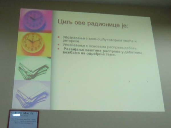 У оквиру пројекта ученици VIII разреда, уз сарадњу са наставницом српског језика Снежаном Цветковић, презентовали су основне принципе дебате и структуру Карл-Поперове дебате. У другом делу свог јавног наступа ученици су извели дебату на тему „Видео-игре подстичу насиље“. Афирмативни и негацијски тим показали су умеће говорења и логичке организације аргументацијских линија и на тренутак оживели ову племениту и запостављену вештину аргументованог разговора.